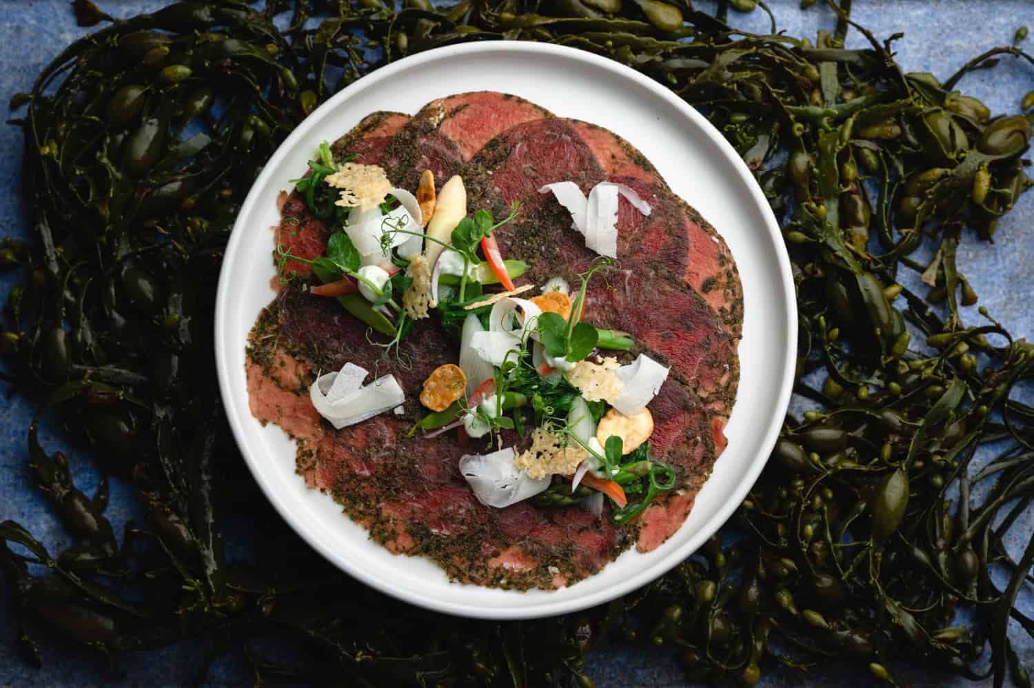 Beef carpaccio enriched with 25% added seaweed. This step has been taken specifically to reduce CO2 emissions. European legislation was due to come into force in 2024, requiring all beef processors to implement CO2 reductions. This legislation has been postponed, but we are still ready for it. The result is a particularly tasty carpaccio, in which the seaweed both adds flavour and reduces CO2 emissions. An additional benefit is, the saving of millions of liters water and agricultural land.