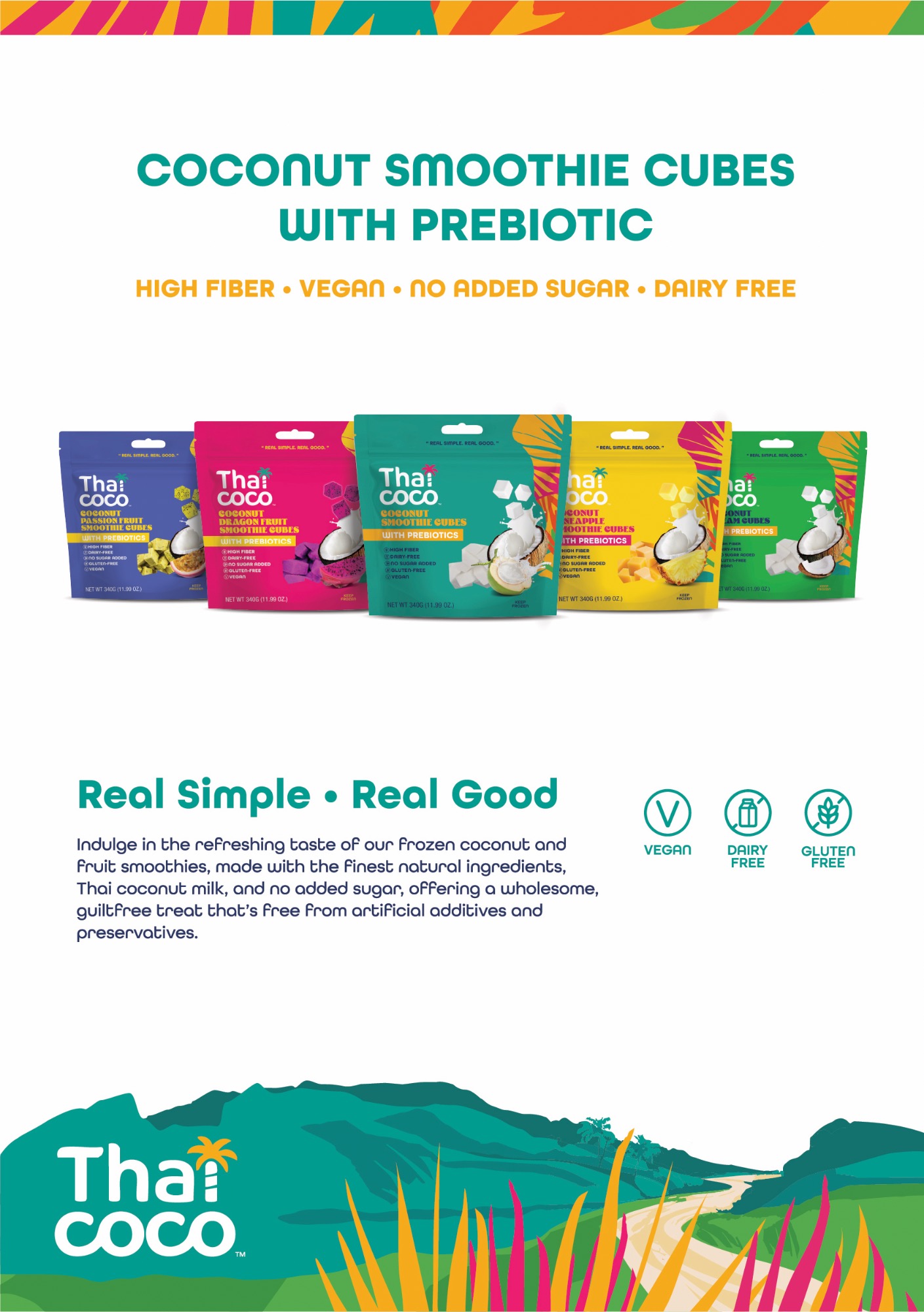 Our Thaicoco Smoothie Cubes with Prebiotic are crafted with a coconut base to deliver a truly tropical taste while nourishing your gut health.Each cube is packed with natural goodness: high in fiber,dairy-free,gluten-free,no sugar added, and 100% vegan. Simply blend with water or your favorite plant-based milk, or enjoy as a daily frozen cubes treat—anytime, anywhere. There are 5 flavors of smoothie cubes to enjoy; Coconut cream, Coconut, Pineapple, Passion fruit, dragon fruit, and pineapple.