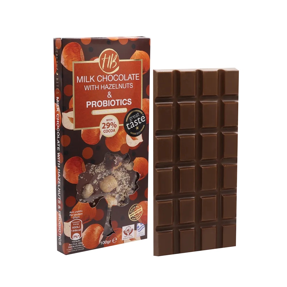A smooth milk chocolate with Greek hazelnuts (Great Taste Award 2024), gluten-free and enriched with 5 billion live probiotic cultures. Supports gut health and protein digestion. Suitable for daily consumption – ideal for people with sensitive intestines and stomach. Made in Greece, no artificial additives, in fully recyclable packaging.